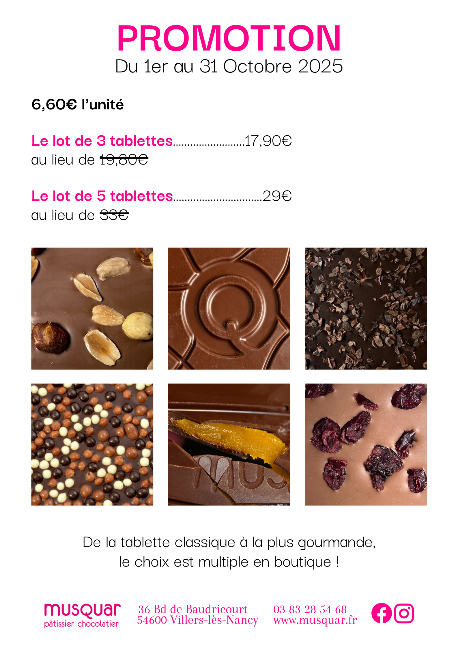 Du 1er au 31 Octobre, retrouvez nos promotions sur nos tablettes, par lot de 3 ou de 5. A vous de choisir en fonction de votre gourmandise !