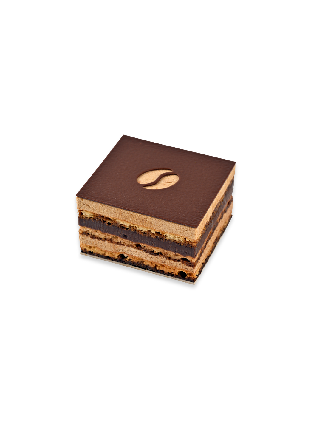 Une ganache chocolat noir grand cru et une crème au café, accompagnée d'un biscuit fondant au café