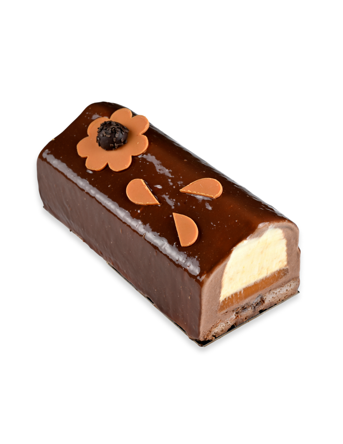 Glace chocolat 80% cacao, cœur caramel mandarine sur un financier chocolat et crumble chocolat