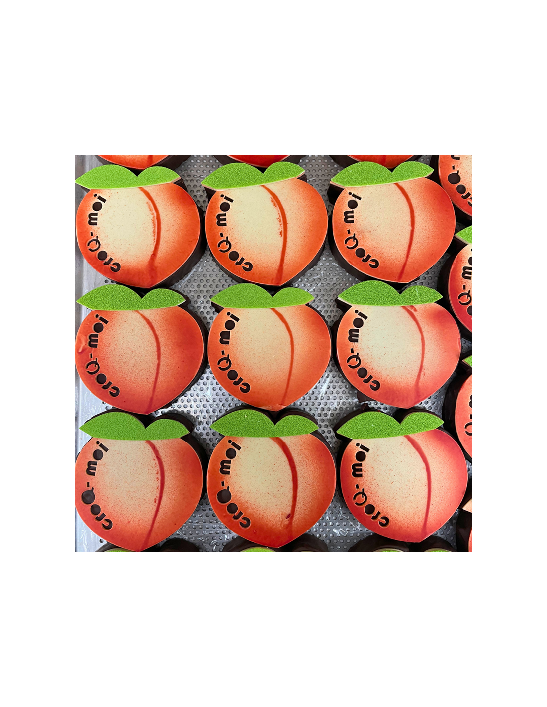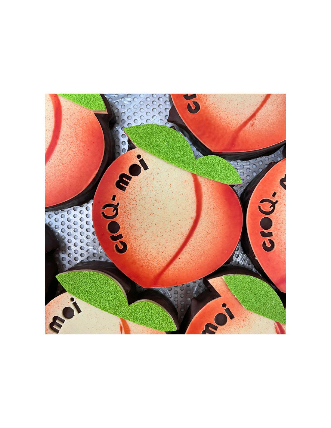 Pâte de fruit à la pêche de vigne et guimauve, enrobées de chocolat noir, et sa plaque en chocolat "CroQ moi"